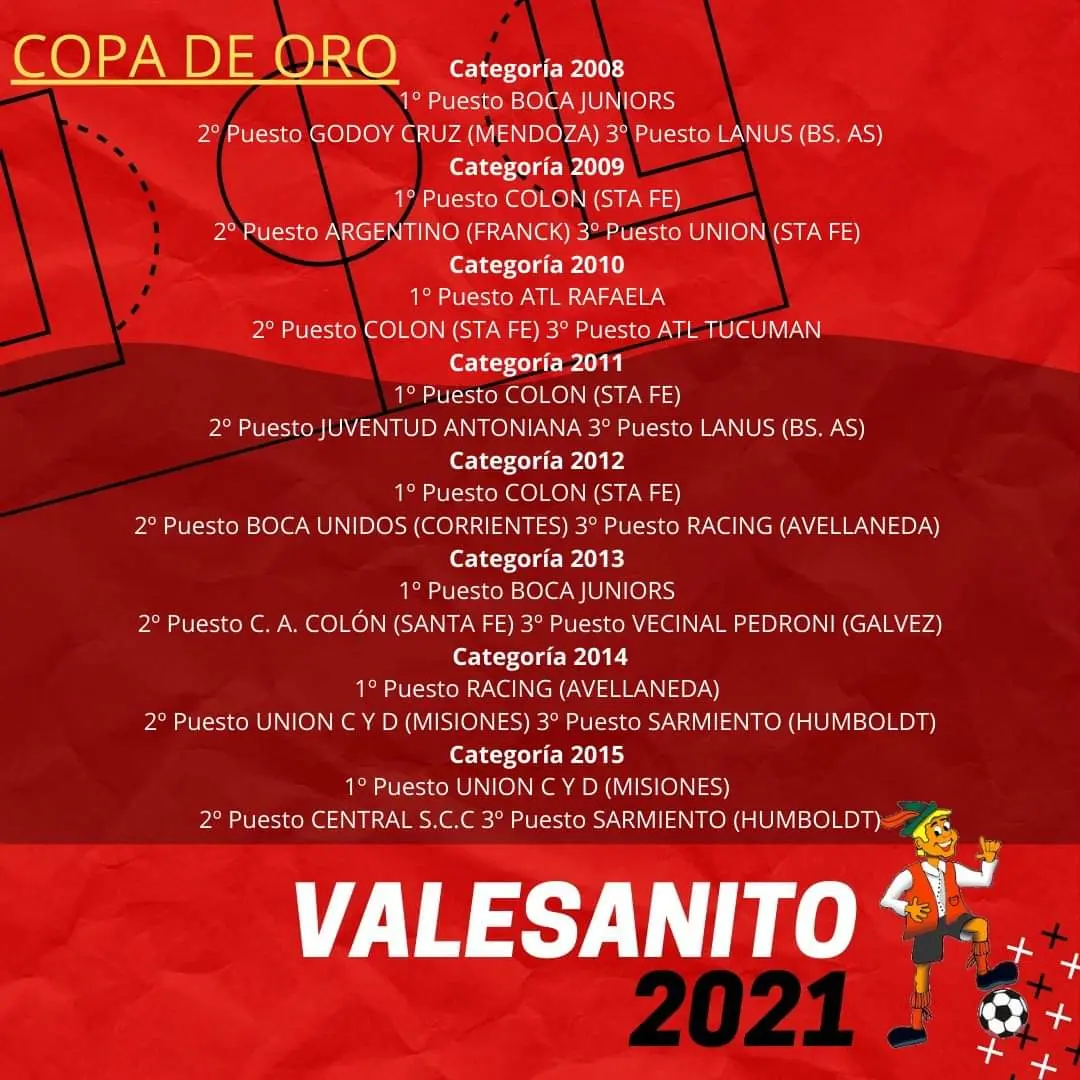 «Felicitaciones a nuestros futbolistas por el logro obtenido en el torneo Internacional Valesanito, logrando el 3′ puesto en la COPA DE ORO. También dichas felicitaciones para los Profes , familiares, amigos y auspiciantes que colaboraron para cumplir este sueño».